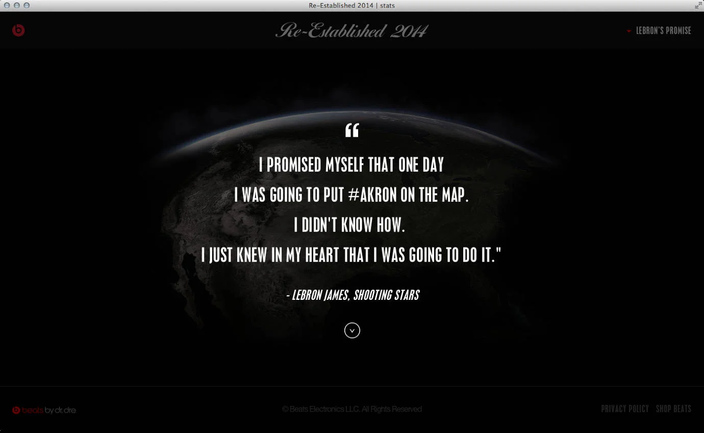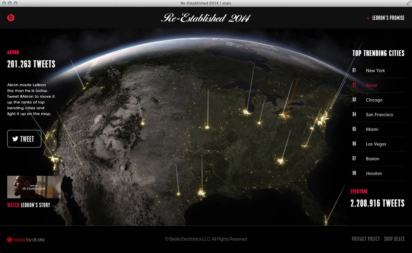 LeBron made a promise as a child to one day put Akron, OH on the map and we wanted to help him do that. So we created this website that launched a day before LeBron's first home game. The site tracked conversations around America's top-trending cities with the goal of getting enough people to talk about #AKRON literally putting it on the map.